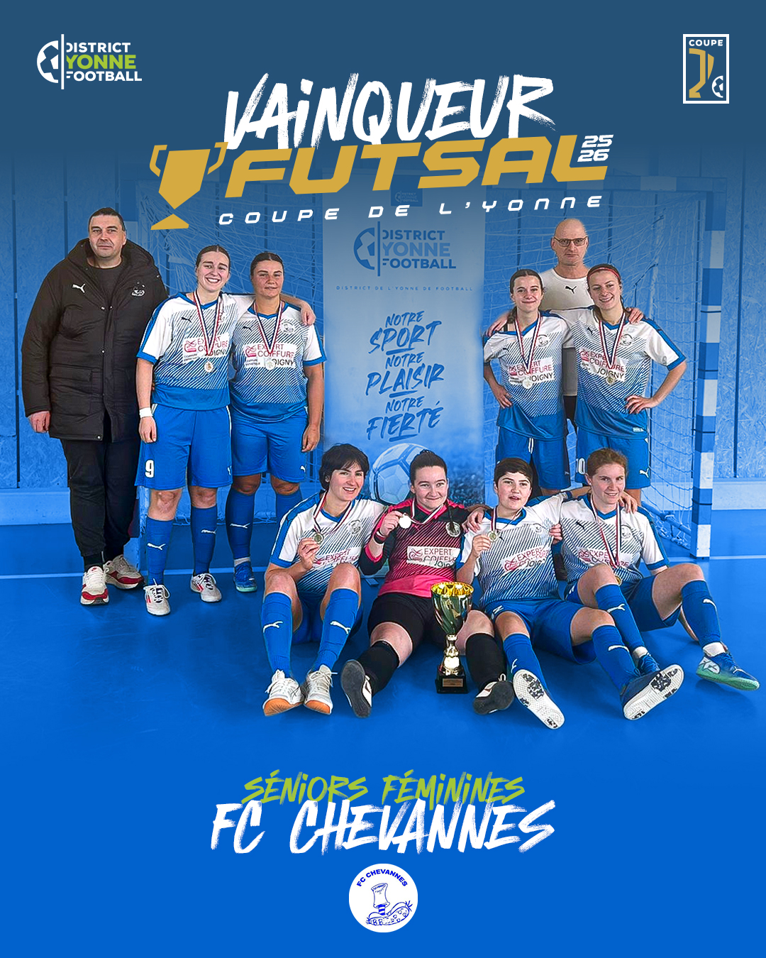 Au terme d’un plateau final intense, rythmé et engagé, ce sont les joueuses de Chevannes qui ont su tirer leur épingle du jeu. Grâce à une prestation solide et maîtrisée, elles décrochent le trophée et s’adjugent le titre de championnes de l’Yonne en futsal senior féminin. Cette victoire permet à Chevannes de représenter fièrement le département lors de la finale régionale, prévue le 8 février prochain, avec l’ambition de porter haut les couleurs de l’Yonne.